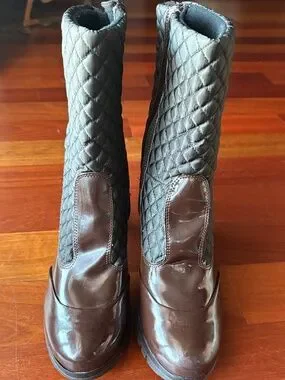 Bring a sleek highlight to your ensemble with these Andre Assous brown quilted mid-calf boots featuring a patent leather toe and a block heel