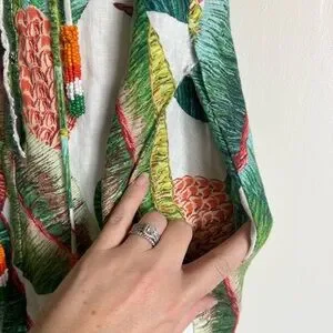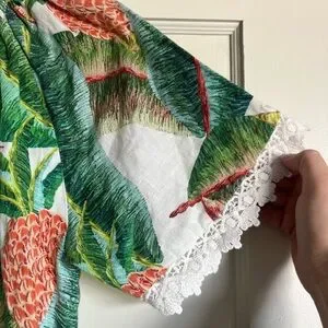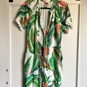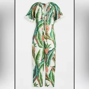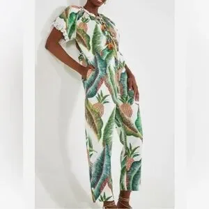 FARM RIO Forest Palm Linen Jumpsuit Size Small MSRP $240 Shell 100% Linen Linning 100% Viscose Tropical pineapple print and lace trim Beaded tassels at front ties Gathered neck line Short sleeves Snaps at front On - seam hip pockets This tropical FARM Rio jumpsuit is finished with crochet trim and beaded tassel
