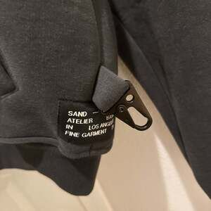 Sand Castle Atelier "The Hoodie" Sandstorm Full Zip Hoodie in a men's size medium. This black full-zip hoodie features "SAND" embroidered on the sleeve and "SAND CASTLE" on the back, along with an industrial-style clip detail on the side. The cuffs are labeled R and L for right and left, ensuring a perfect fit, and the front tag reads "Sand - Castle, Sand Atelier in Los Angeles, Fine Garment." The hoodie is new and is in excellent condition with no noticeable flaws. Perfect for everyday wear or as a statement streetwear piece.