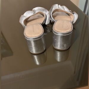 Elegant silver leather sandals with ruffle detail. Perfect for any occasion. Slip-on style for easy wear, size 9 but fits best for narrow feet.