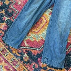 & Denim | Women’s medium blue lightweight denim jumpsuit. Long sleeves, tie waist, single breast pocket, side/back pockets, hidden button front. Machine wash warm, 100% cotton. Women’s size 6