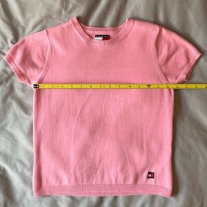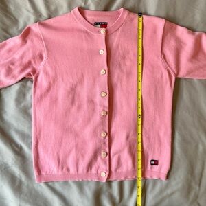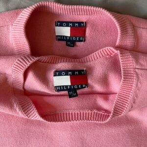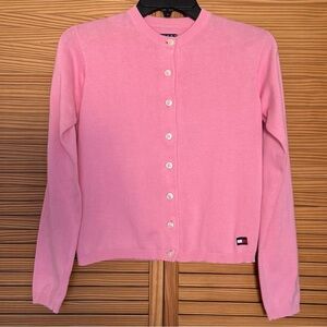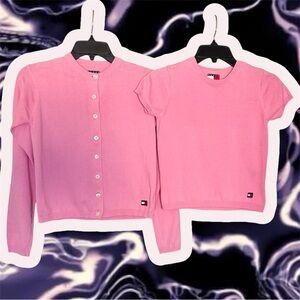 Amazing vintage Y2K Tommy Hilfiger bubblegum pink cardigans twin set. Sz jrs medium. It’s meant to fit super tiny (typical Y2K style). Cropped. Baby tee style. I’m a 6/8 and it’s too tight on me. In my opinion this would look and feel best on an XS or S. But, go by measurements in photos. In excellent condition. slight fuzzing to the fabric - to the naked eye this set looks nearly perfect (see pix). Classic cotton sweater material. Two looks in one!