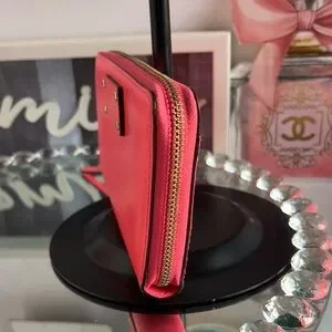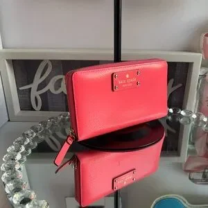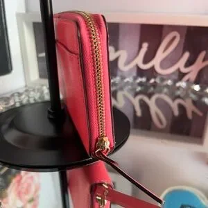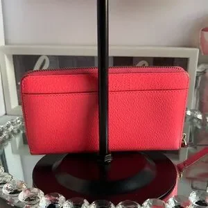 Elegant Kate Spade wallet in a striking coral hue. Features a zip-around closure and signature logo plate.