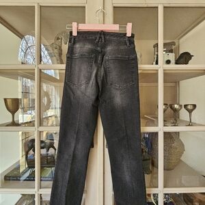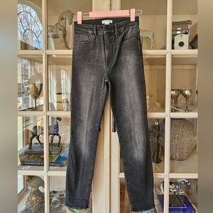 Zip fly, mid-high rise, skinny leg, cropped length, frayed / raw hem.