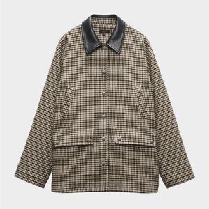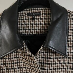 Stylish houndstooth blazer by Rag & Bone. Beautiful houndstooth wool and leather collar. Hand warmer and front flap pockets. Lined. Snap front. 24.5” across the chest. Size is Large but I wear an XL and it fits with a light sweater underneath. Worn twice so in excellent condition. Smoke free home. I added online pics so you can see it on a real person.