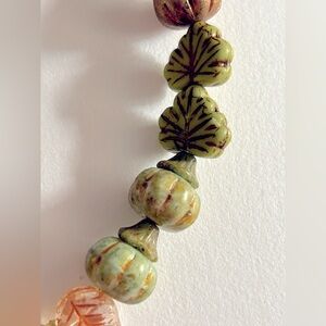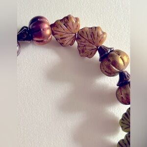 NWOT Bracelet, Czech Glass Pumpkins & Autumn Leaf shape beads, with contrasting embossed leaf veins. Bronze, cranberry, tan, Copper, & Olive, smoky tones, metallic highlights. Green Leaf dangling charm. Stretchy, One size fits most (Osfm). Comfortable on my 8” wrist. Great for Fall, Thanksgiving!