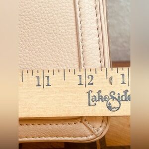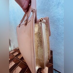 Elevate your style with this Tory Burch Duet Chain Convertible Satchel in Light Oak/Spark Gold (dusty pink). Crafted from high-quality leather, this large satchel/top handle bag features a magnetic and zip closure, gold hardware, and a detachable shoulder strap. The bag is lined with a pink fabric.
