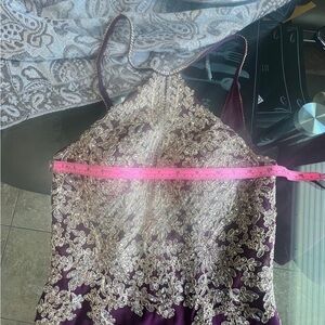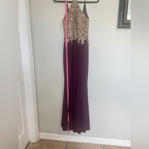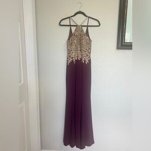 Chic maxi dress with burgundy base. Gold embellishments add elegance. Ideal for special events.