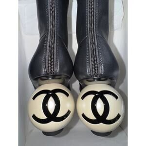 Chanel 25K Black White Pearl Ball Heel CC Logo Stretch Leather Calf Boots 37.5