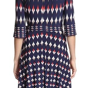 Stylish faux wrap knit dress with a retro geometric pattern. Back zip up.