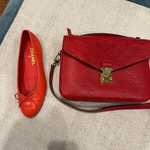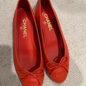 Elegant red CHANEL ballet flats. Chic and gorgeous leather. Rare color and near perfect condition. I have box and dust bags. Only reason I’m selling is feet grew with pregnancy and they are too small. 😩