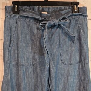 In excellent used condition no flaws. Denim color with lightweight feel. 2 front pockets with pull on elastic waist and attached adjustable tie
