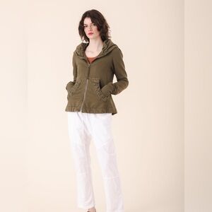 A Prairie Underground classic, first introduced in 2006 and one of our longest running styles. Dramatic fit and flare shaping with seamless sides and back belt inset. Ultra femme design lines and pockets embellished with gathered muslin insets are balanced by extra-long sleeves that can be gathered along the arm or won over the hand in cooler climes. When unzipped the hood may be draped over the shoulder.