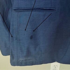 - I've priced this very low considering that it will need to be sent dry cleaners. Don't know what the spots are but I assume a good dry cleaners could get them out - of course I can't guarantee. Priced accordingly! Pockets and back vent still stitched closed as brand new from manufacturer. Comes with 2 extra buttons.