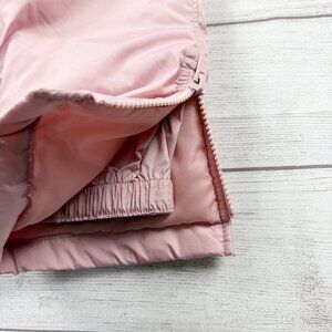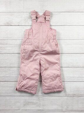 Solid pink snowbib snow bibs snow pants. Adjustable straps. Zip chest. Cuffed inner legs. Zip on side of legs