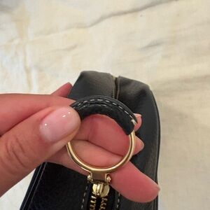 Elegant Coach toiletry bag in black. Features gold-tone logo and zipper. Ideal for travel and organization.