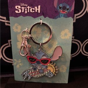 Charming Disney Stitch keychain. Features playful red sunglasses and blue accents. Perfect for Disney fans.
