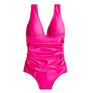 Vibrant pink one-piece swimsuit. Features a deep V-neck and ruched detailing. Perfect for a stylish beach day.