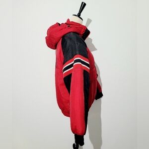 Show off your team pride in this vintage University of Nebraska Cornhuskers pullover jacket by Genuine Stuff Collegiate. This retro-style jacket features bold red and black color blocking, a large front pouch pocket, side zip, and a hood for extra warmth. "Nebraska" is embroidered on the back and chest, along with the Husker “N” logo on the front flap pocket.