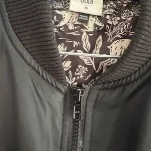 Stylish black jacket with cream sherpa lining. Features zip closure and side pockets. Perfect for layering. My favorite Cabi item EVER but I lost weight since last winter. Medium
