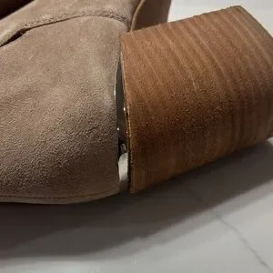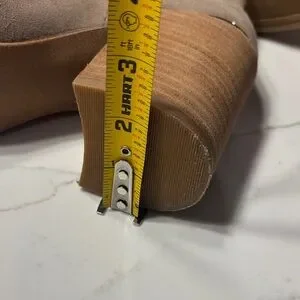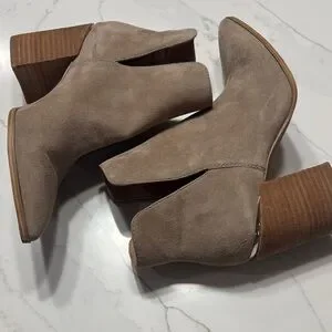 Stylish beige ankle booties with a sleek design. Features a stacked heel for added height. Good condition see pictures and video for details.