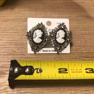 Vintage Cameo Silver Plated Diamond Cut Rhinestone Black White Portrait Earrings