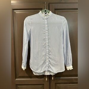 J. Crew Drapey Long-Sleeve Button Up. Smooth, Silky Cupro-Blend. Blue and White Stripes. Ruffle Trim. Great for Layering!!
