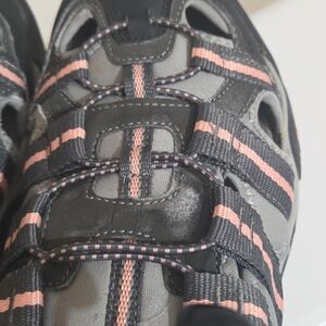 The Atika Women's Athletic Outdoor/Water Sandal in size 10 features a closed toe design in a stylish gray and coral color combination.