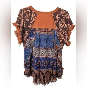 Umgee Terracotta Boho Patchwork Tee Flutter Sleeve Raw Edge Medium. Small stain on front-hasn’t been treated. See closeup pic.
