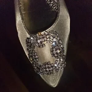 Sheer golden mesh brings breezy shimmer to a pointy-toe pump finished with a dazzling crystal buckle based on one that Manolo Blahnik found in Italy. Part of the Golden Anniversary collection, this lavishly whimsical take on a classic style features a golden disc on the sole to celebrate the label's 50 years of masterful artisanry.