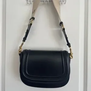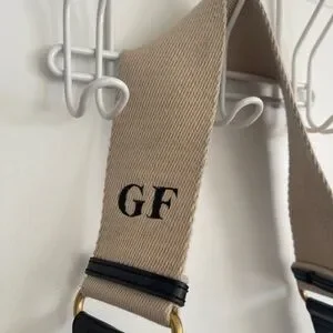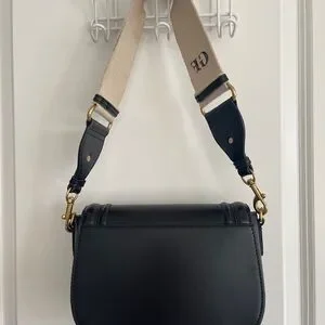 Elegant black leather crossbody bag with adjustable strap. The bag is like new, great condition. But the strap has been used, the color has faded to dark color from sweaters, can be replaced with other camera strap you can find. Has a GF embroidery on the strap.