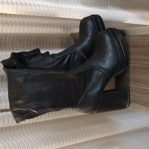 These striking over the knee boots feature a sleek black design with a substantial block heel and a thick platform sole. Crafted from a leather-like material, they offer a minimalist silhouette with a roundish toe, making them a bold statement piece for any wardrobe. Stretchy and sexy. Very Sexy. The box is damaged. I wear a size 8.5-9 these are a little big on me.