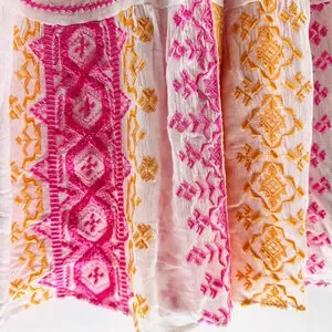 This pre-owned Hale Bob maxi skirt, size M, is white and adorned with intricate pink and orange embroidery. The design includes a smocked elastic waistband and a tiered construction, showcasing various geometric and floral-inspired patterns throughout. Material tags shows 100% Viscose shell, 100% Cotton lining, and 100% Polyester embroidery. The garment appears in good overall condition with no significant visible imperfections or signs of wear. STILL ON THE HALE BOB WEBSITE FOR $180!!