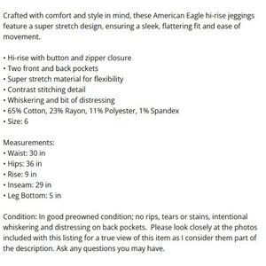 Crafted with comfort and style in mind, these American Eagle hi-rise jeggings feature a super stretch design, ensuring a sleek, flattering fit and ease of movement.