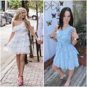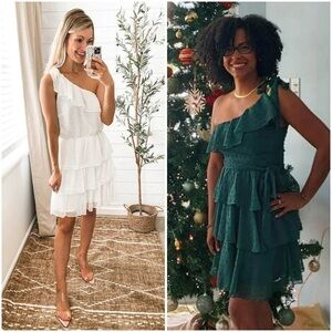 NWT BTFBM Green One Shoulder Tiered Frill Ruffle Swiss Dot Flowy Mini Dress L