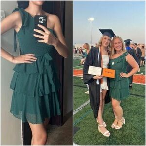 New w/ tags BTFBM Emerald Green Sleeveless One Shoulder Tiered Frilly Ruffle Swiss Dot Mini Dress.