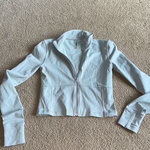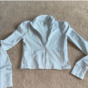 light blue, zip-up, cropped, fleece, sporty, casual, minimalist, athleisure, cozy, winter