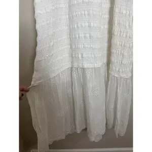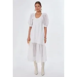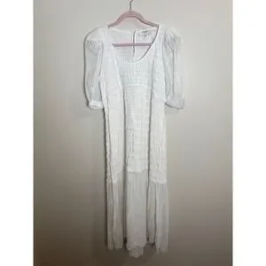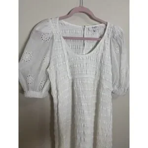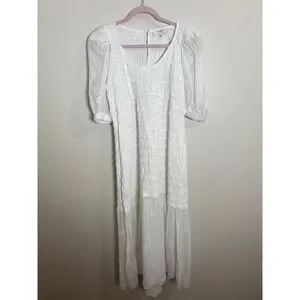 Keywords: SEA NY dress, white dress, eyelet dress, puff sleeve dress, smocked dress, midi dress, bohemian dress, feminine dress, summer dress, brunch dress, garden party dress, romantic dress, tiered hem dress