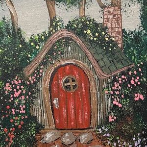Bring a touch of whimsy to your home with this charming painting featuring a red door cottage surrounded by lush greenery and colorful flowers. Perfect for adding a cozy and inviting atmosphere to any room. 8 x 10inches