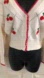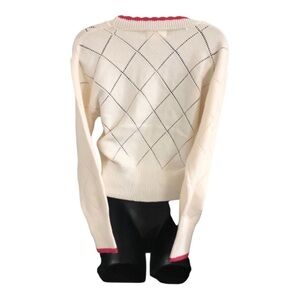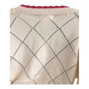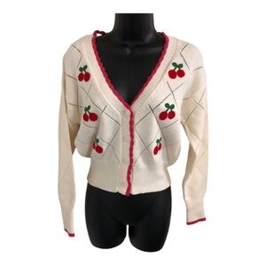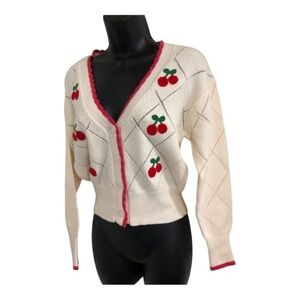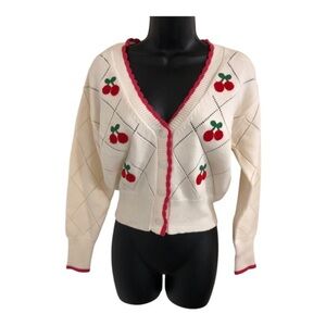 Jessica Simpson cream & pink scalloped trim cherry diamond pattern cardigan sz M