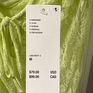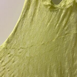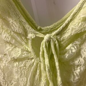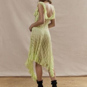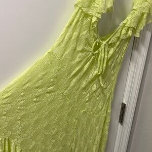 Elegant lace dress with ruffle details. Features a light green color. Never worn tags attached.