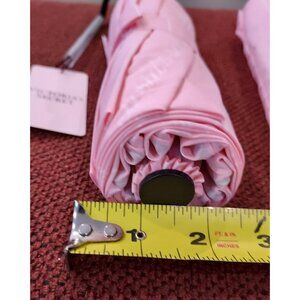 The New Victoria's Secret Pink Mini Striped Portable Logo Compact Travel Umbrella is a stylish and practical accessory for women on the go. Made of durable polyester material, this compact umbrella features a cute pink striped design with the iconic Victoria's Secret logo accents. Its automatic open and close function makes it easy to use, while the strap adds convenience for carrying. Perfect for travel, this one-size umbrella combines fashion and functionality in a compact and portable design. Stay dry and chic with this must-have travel essential from Victoria's Secret. 10 inches long