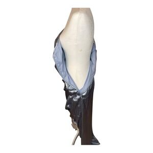 Chic strapless gown with a metallic blue ice sheen. Perfect for formal occasions.