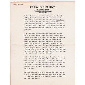 Original 1982 Amos Eno Gallery art card for Michael Eastman’s “Scenes from the Kama-Sutra” exhibition, New York City. Includes vibrant 5.5" x 8.5" folded card (opens to 8.5" x 11") and rare typed gallery press release (folded inside).