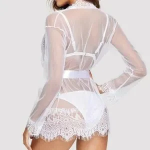 New White Lace Sheer Short Robe Top Ribbon Tied Waist