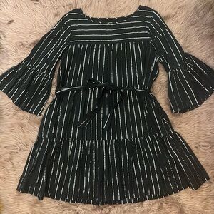 Stylish dress with flared sleeves and iridescent silver stripes. Features a tie waist. Ideal for casual holiday outings- just enough sparkle to brighten up the dark nights!