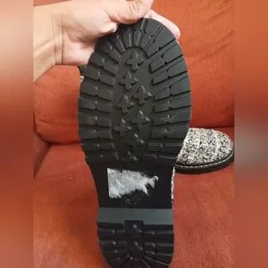 Chic tweed moto boots. Black and white design. Sturdy lace-up style.