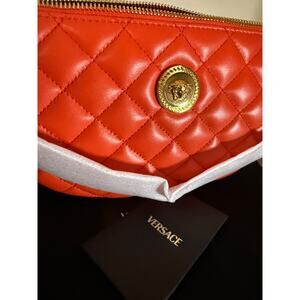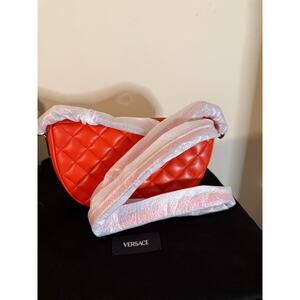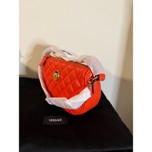 Add a touch of luxury to your wardrobe with this stunning Versace crossbody bag. Crafted from high-quality coral lambskin, this bag features the iconic gold Medusa emblem.
