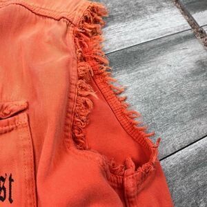 Ride in style with this rugged Biker Wear USA sleeveless button-down vest. Features a burnt orange denim fabric, raw cut-off sleeves, and bold Southernmost Rider Key West, FL graphics on the front and back — perfect for motorcycle enthusiasts or casual streetwear looks.