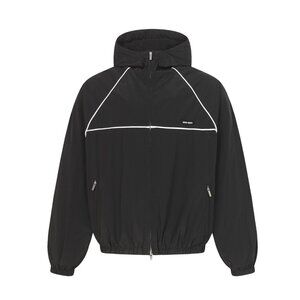 Technical silk fabric with a sporty, casual feel enhances the lines of this zipper blouson jacket that is perfect paired with classic garments to express the essence of the Miu Miu uniform.